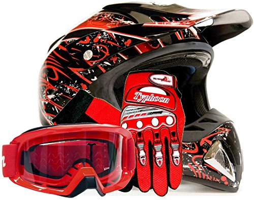 Everything you expect from TYPHOON HELMETS. High quality package including helmet, goggles and gloves. Helmet is loaded with features including an easily removable and machine washable liner, certified to meet the DOT standard (FMVSS 218), fully vented sculpted shell and more! This is the perfect choice for those looking for high quality motocross, off-on road, or ATV gear at an affordable price. Glove style may be slightly different. Please measure for size. Each manufacturers sizing is different. SIZE CHART (Circumference of the largest part of your head, usually just above the eyebrows) in inches SMALL: 22 to 22 ½ - MEDIUM: 22 ½ to 23 - LARGE: 23 to 23 ½ - XL: 23 ½ to 24 - XXL: 24 to 25 Head shapes can affect how a helmet fits. The size chart is meant to be a starting point.