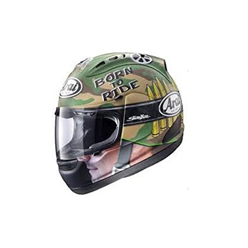 This is a replica of the helmet Born to Ride Nicky Hayden wore in Moto Gp racing in 2013. It features the Vietnam era helmet look.Limited to 200 Helmets . The new Arai Corsair V Helmet proves again that Arais main focus is the experienced rider who knows what a real helmet should do and have. It doesnt fling fashion at you; it advanced the art of building better helmets for riders. Its improvements and innovations reach down to the smallest details. Why? Partly obsession. Partly because Arai believes every part of a helmet is interrelated in both design and function. We dont believe in change for the sake of change, fad, or marketing shock value.