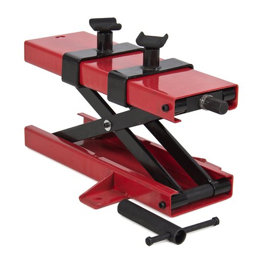 This scissor lift is great for motorcycles, ATV;s, dirt bikes and smaller similar vehicles. It can be used alone or with almost any motorcycle lift. It has a 1100 lb. capacity, made of solid steel and it's easy to use. FEATURES: Solid steel construction in a red and black powder coated finish; Two (2) variable screw adapters; Simple crank operation; 6" removable crank handle SPECIFICATIONS: 3" wings on each side for stability and balance; Compact dimensions: 19"(L) x 6"(W) x 3.75(H); Lifting Range: 3.75" - 15.75
