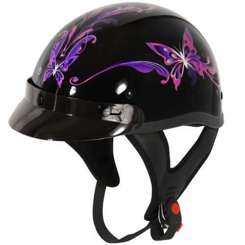 This half-helmet by Outlaw has a wet, glossy finish, a removable snap-off visor, and intricate Purple Butterfly Graphics. All Outlaw helmets meet or exceed DOT certification and are made to enhance any riding experience.